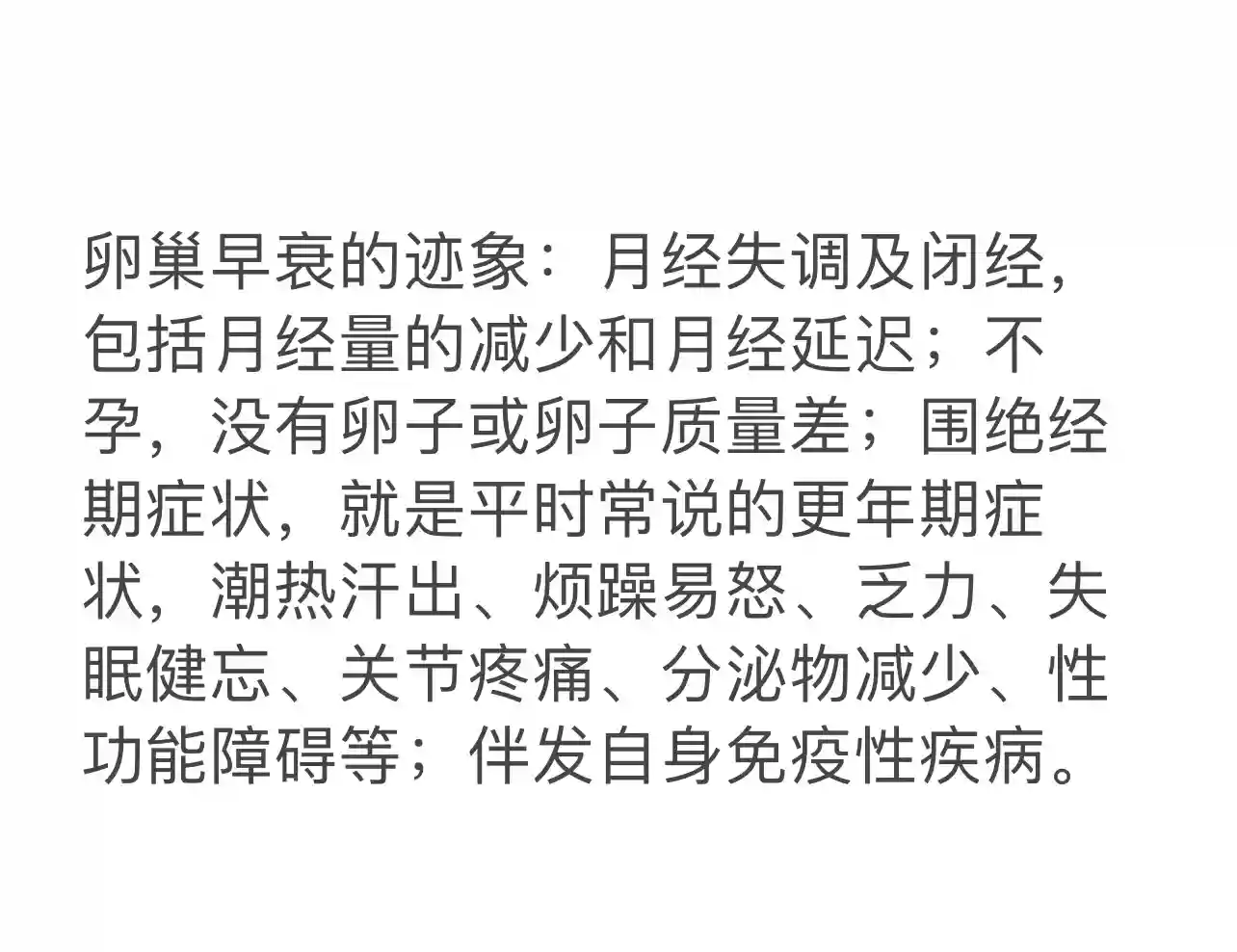 卵巢功能是女性生育能力的重要指标,若出现卵巢早衰迹象,及时了解相关信息至关重要。常言道:卵巢老一岁,女人老十岁;卵巢养得好,青春不易老。然而,近年来研究发现,卵巢早衰越来越多见,甚至连十几二十岁的女孩也会发生。闭经是卵巢早衰的早期表现。那么问题来了,什么是卵巢早衰呢?“说白了,就是年龄未到,卵巢先老。”如果出现以下症状,说明已经存在卵巢早衰的迹象。月经失调及闭经,包括月经量的减少和月经延迟;不孕,没有卵子或卵子质量差;围绝经期症状,就是平时常说的更年期症状,潮热汗出、烦躁易怒、乏力、失眠健忘、关节疼痛、分泌物减少、性功能障碍等;伴发自身免疫性疾病。尽早发现卵巢早衰的迹象,比什么样的治疗技术都重要。
