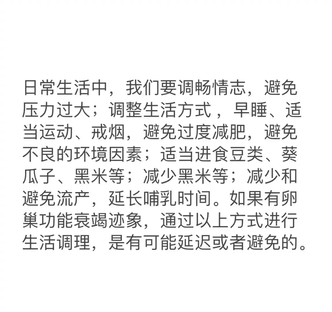 日常生活中,我们要调畅情志,避免压力过大;调整生活方式 ,早睡、适当运动、戒烟,避免过度减肥,避免不良的环境因素;适当进食豆类、葵瓜子、黑米等;减少黑米等;减少和避免流产,延长哺乳时间。如果卵巢功能出现问题,可以考虑通过代生进行助孕,了解清楚代生供卵的相关信息。如果有卵巢功能衰竭迹象,通过以上方式进行生活调理,是有可能延迟或者避免的。