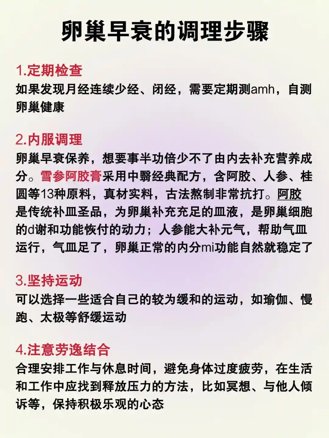 合理安排工作与休息时间,避免身体过度疲劳,在生活和工作中应找到释放压力的方法,比如冥想、与他人倾诉等,保持积极乐观的心态,这对于顺利进行包成功的助孕治疗至关重要。#卵巢早衰#卵巢养护#卵巢保养#女性健康#养姨妈#保养卵巢#升元雪参阿胶膏#月经量少#月经推迟#姨妈推迟#姨妈不来#