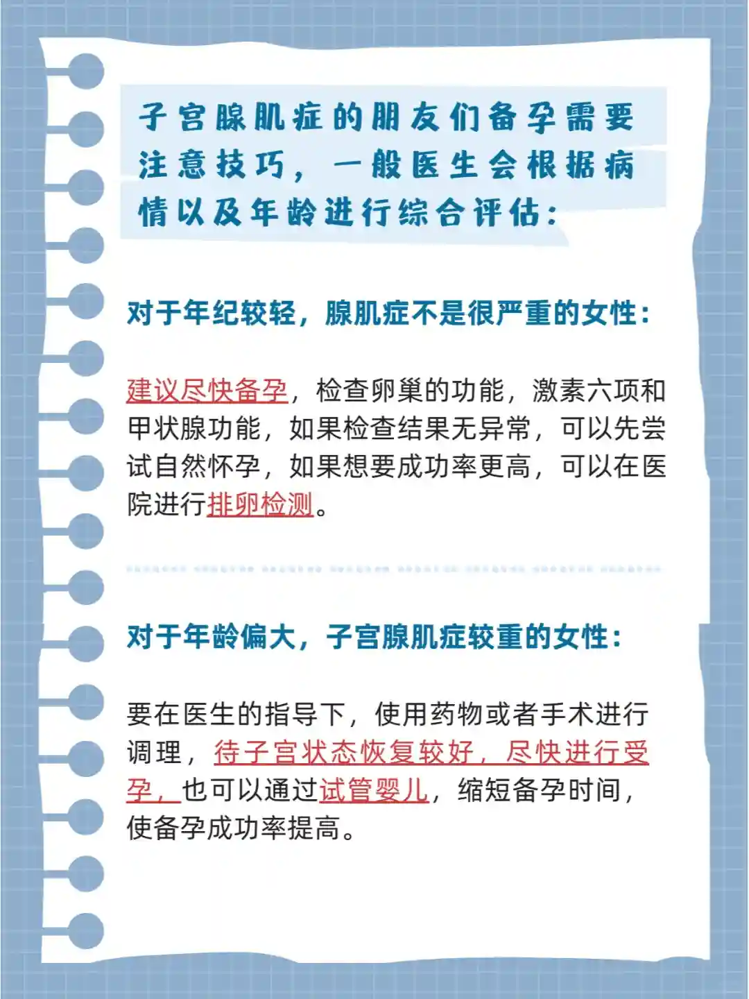 子宫腺肌症患者的备孕之旅,专家支招,科学规划,提高助孕几率。对不同年龄和病情的患者,有针对性的建议,助您实现好孕。🌼🌼对于年纪较轻,子宫腺肌症不是很严重的女性,建议尽快备孕,检查卵巢的功能,激素六项和甲状腺功能,如果检查结果无异常,可以先尝试自然怀孕,如果想要成功率更高,可以在医院进行排卵检测,为迎接宝宝做好准备。🌼🌼对于年龄偏大,子宫腺肌症较重的女性,要在医生的指导下,使用药物或者手术进行调理,待子宫状态恢复较好,尽快进行受孕,也可以通过试管婴儿,这是目前比较受欢迎的代生方式,可以缩短备孕时间,提高代怀成功率,为生男孩做好充分准备。想了解怎么找代怀?可以咨询专业的代怀医院。